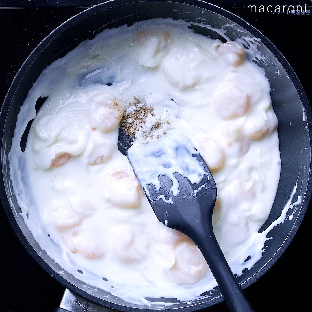 5: 牛乳を4〜5回に分けて加え、都度混ぜ合わせてとろみをつけます。