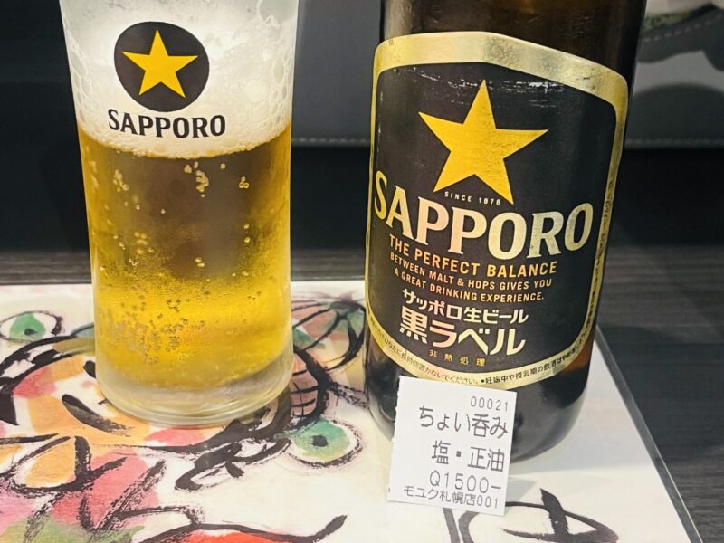 席に着くとすぐにお水、次にしっかりと冷えた瓶ビールサッポロ黒ラベルが。ザンギ用のマヨタルソースと山椒塩もセットされました。