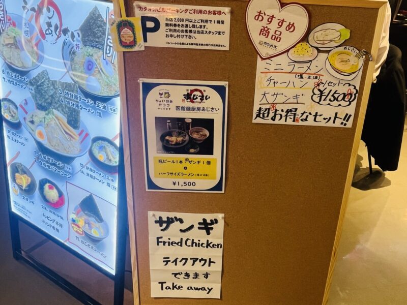 他にもミニラーメン+チャーハン+大ザンギ=¥1,500のおすすめメニューなども気になります。大ザンギテイクアウトもできるのか!また来よう。