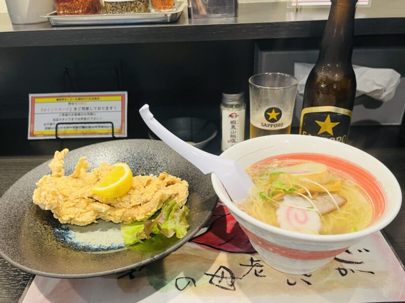 こちらがあじさいのちょい飲みセット完成形。単品だと瓶ビール¥450 、大ザンギ¥450なのでハーフラーメン¥600で食べられたという計算になるかな。わたし的には満足なセットでした。足りないという方は無料ライスもいただくと良いかも。