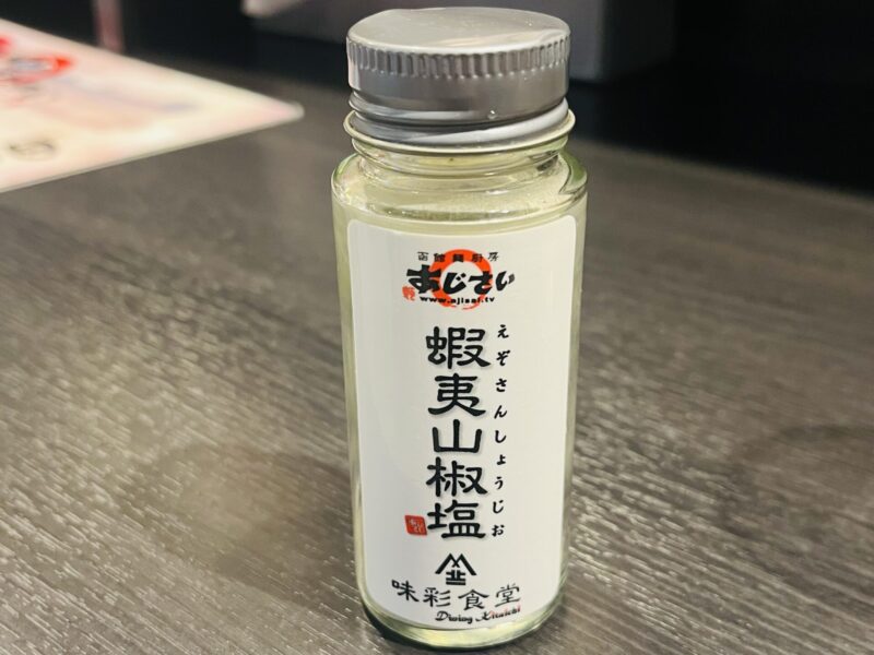 「蝦夷山椒塩」をつけてみるとスパイシーな味変がまた美味しい。調べたところ、あじさいオリジナルスパイスで公式通販で購入できます。揚げ物、肉料理などさまざまな料理に使える秘伝のスパイス…はい買います。