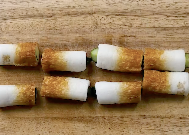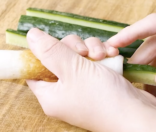 2: ちくわの穴にきゅうりを入れます。ちくわを半分に切ります。