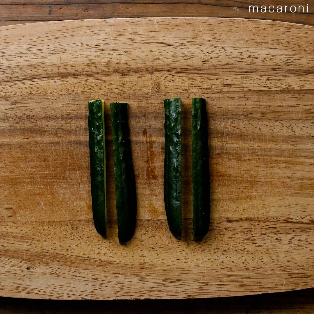 1: きゅうりを縦4等分に切ります。