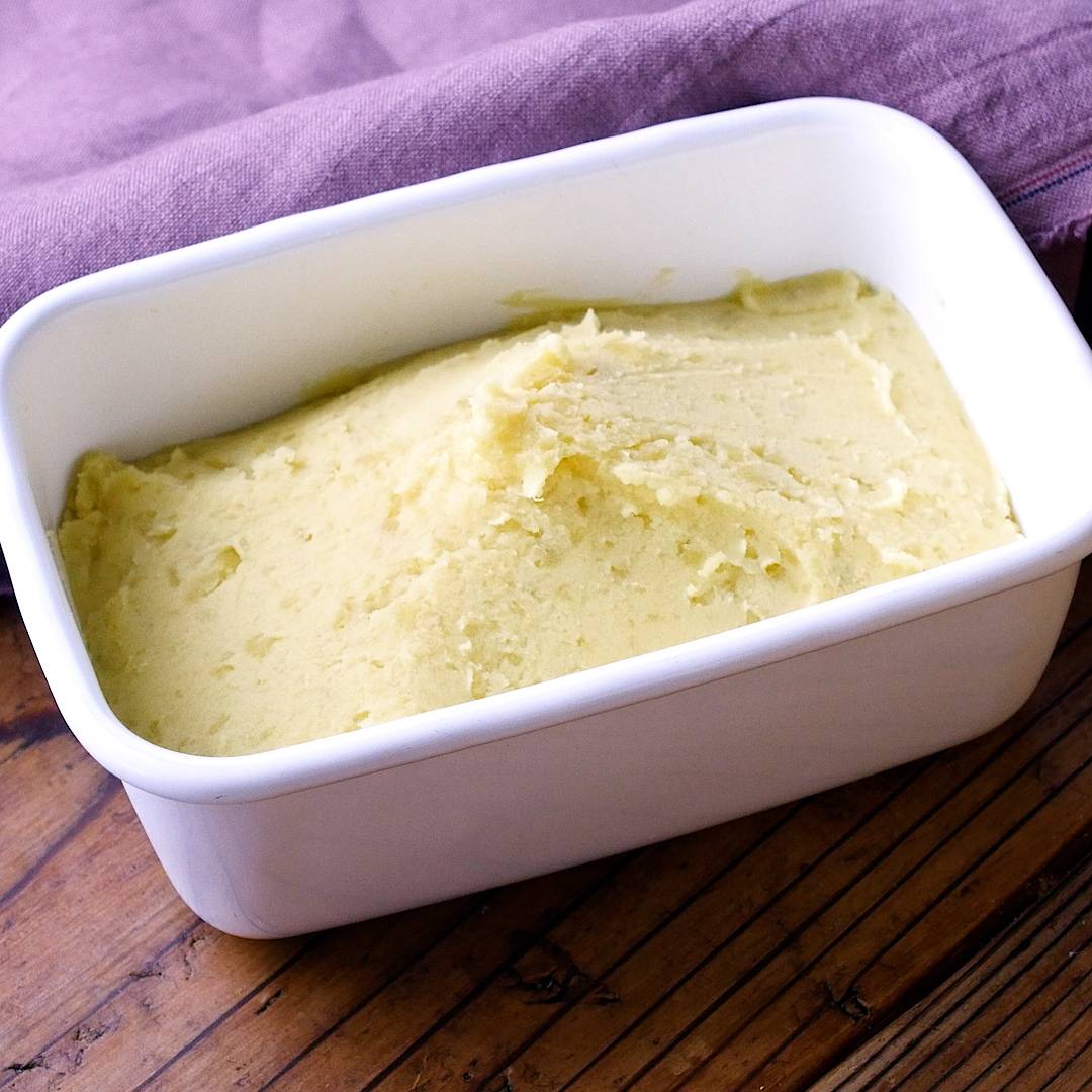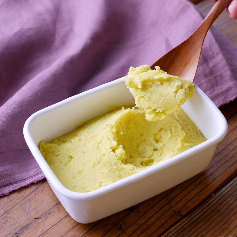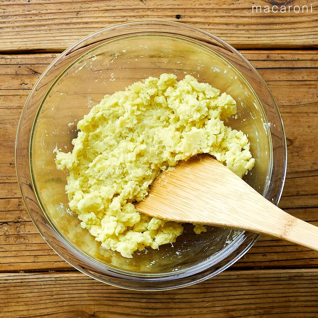 4: ボウルに入れ、熱いうちにバター・塩を入れて木べらでつぶします。
