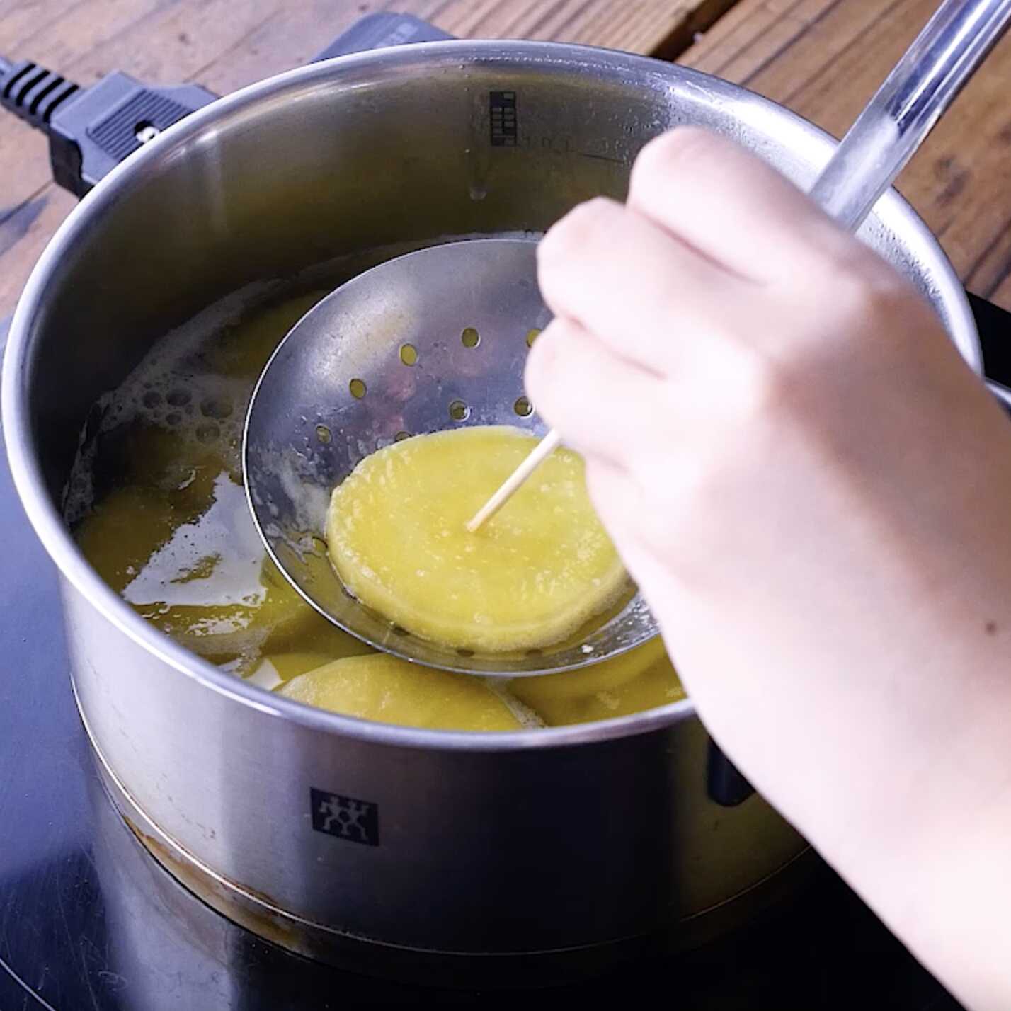 1: さつまいもの皮をむき、1cm幅の輪切りにします。