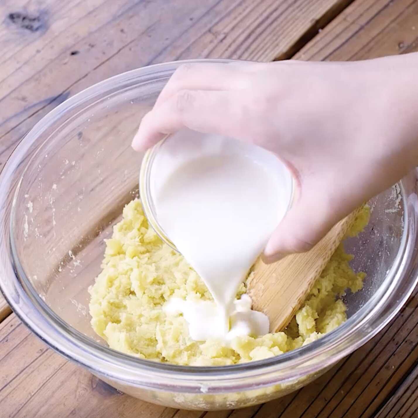 5: 牛乳を少しずつ加え、なめらかになるまでしっかり混ぜ合わせます。