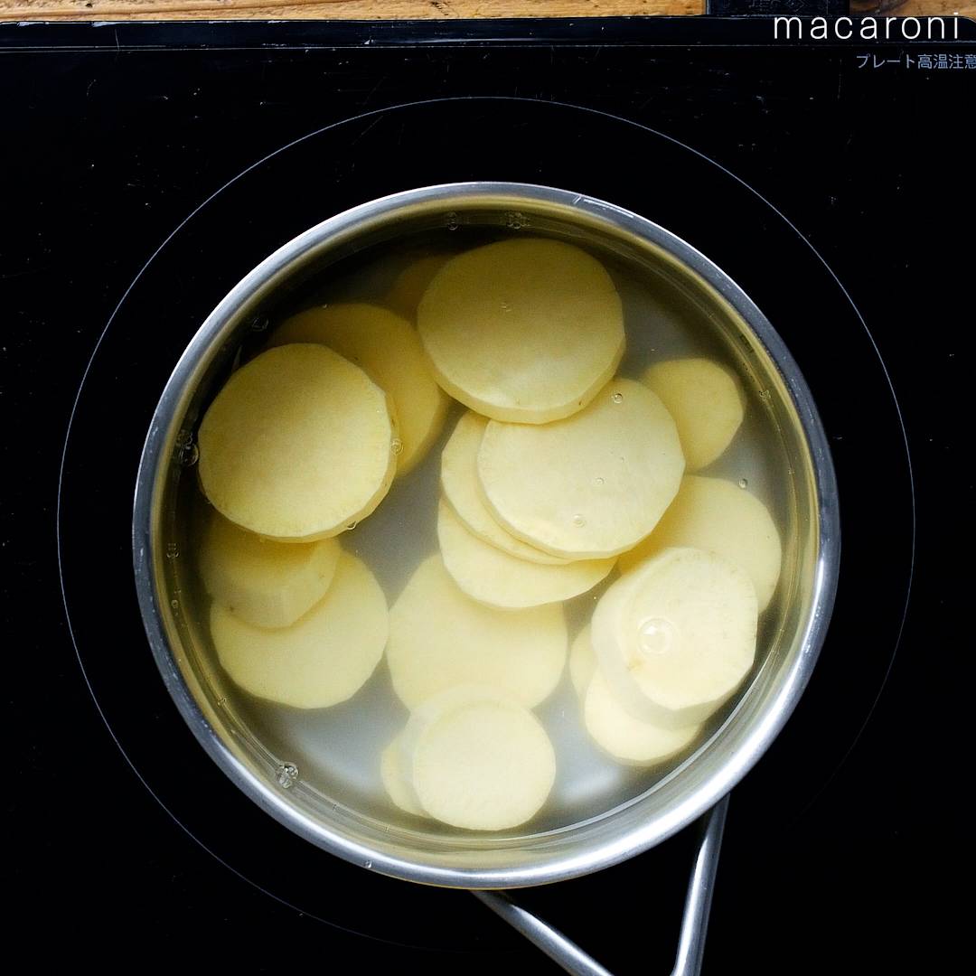 2: 鍋にさつまいも・水(分量外)をかぶる程度いれ、中火にかけて沸騰させます。