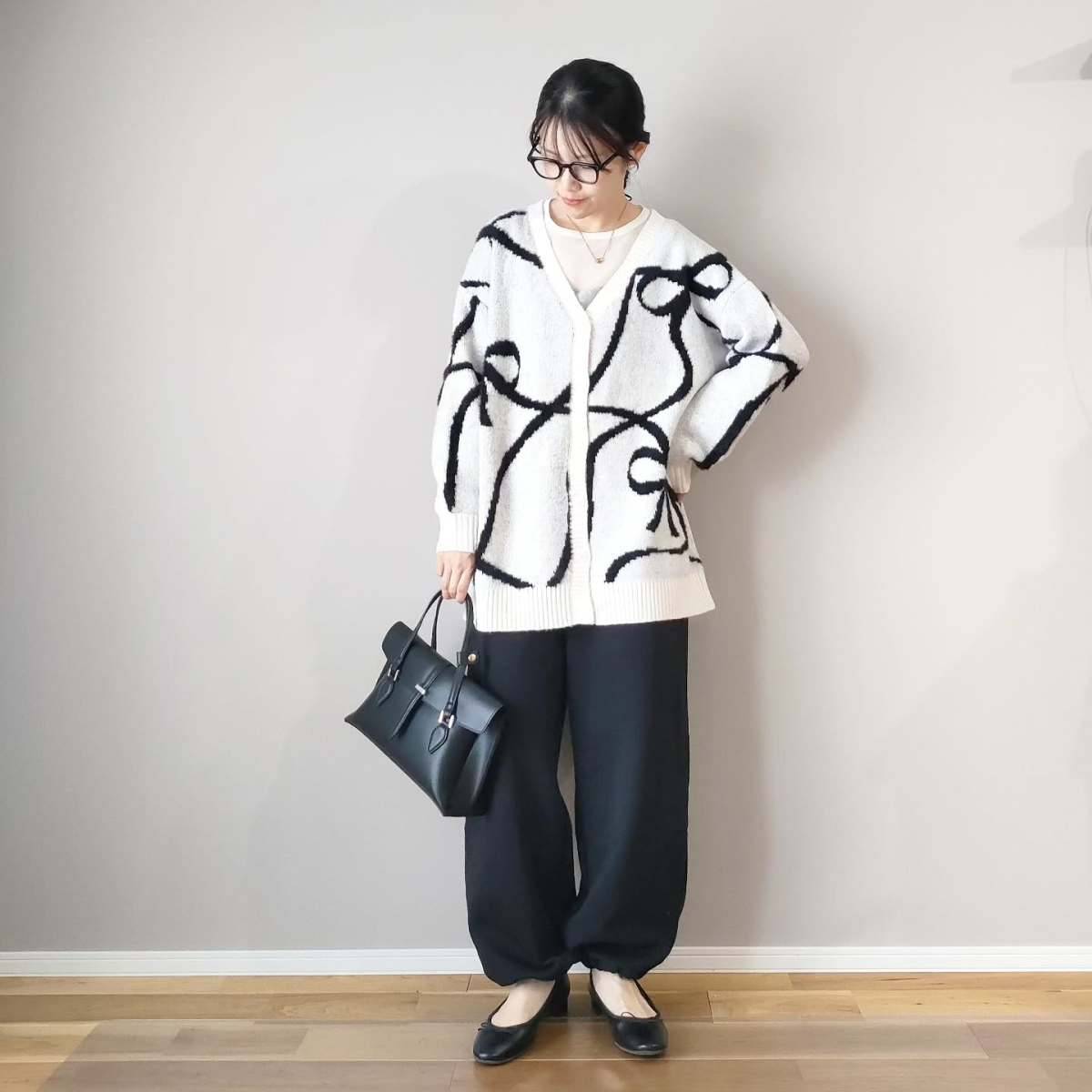 フェミニンで今っぽいリボン柄のカーディガンを主役にすれば、おしゃれで老け見えしない11月向けファッションが完成します♪