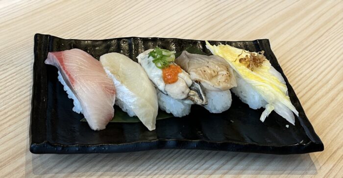 左から ぶり、八角、蒸しがき、ホッキ貝炙り、白菜漬け