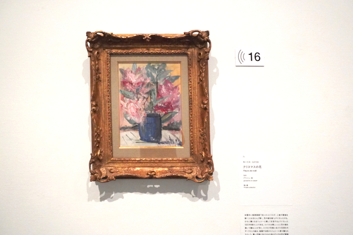 ユトリロの作品は建物や街並みが際立っており、人物や静物が画題になることは少なかったが、後に妻となるベルギーの銀行家未亡人、リュシー・ポーウェルとの交流以来は花の絵を描くようになったという。《クリスマスの花》はリュシーと住むようになってから制作されたもので、赤やピンクなどの花が画面いっぱいに咲き誇る華やかな絵だ。本展では、ユトリロの人間関係や環境の変化が伝わる作品も紹介されている。