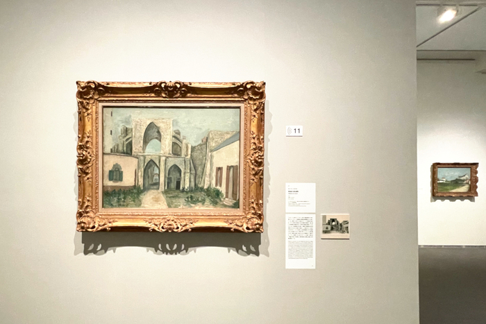 風景画家として知られるユトリロだが、実際に景色を見に行って描くことはほとんどなく、葉書や名所の写真を見て制作することが多かったという。店や道を描いた絵でも、人や動物の姿がほぼないのは、その場所を観光地として捉えた資料を元にしているためだろう。本展は、モチーフとなったであろう写真や葉書が並んで展示されている作品もあり、観光地の資料が画家の手によって無二の絵となっているさまが伝わってくる。