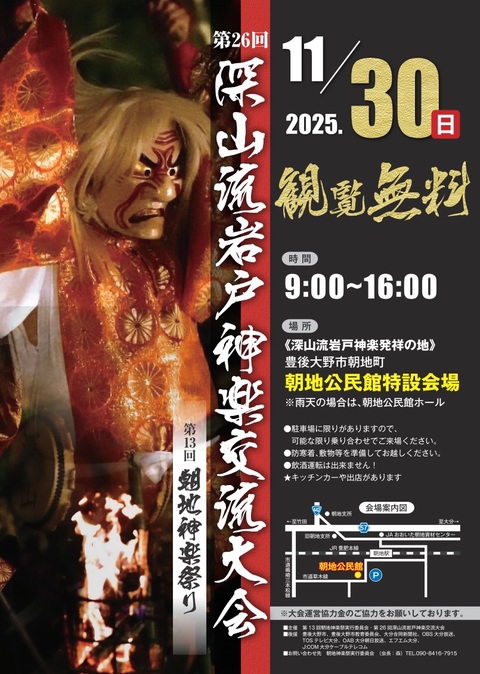 豊後大野市で『第13回 朝地神楽祭り(第26回 深山流岩戸神楽交流大会)』が開催されます