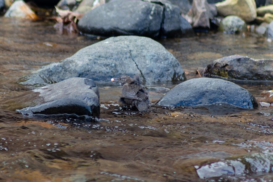そんなシロザケの雄姿を目に焼き付けていると、小さくカワイイ鳥がシロザケたちのすぐ横でモゾモゾしています。おそらくカワガラスです。