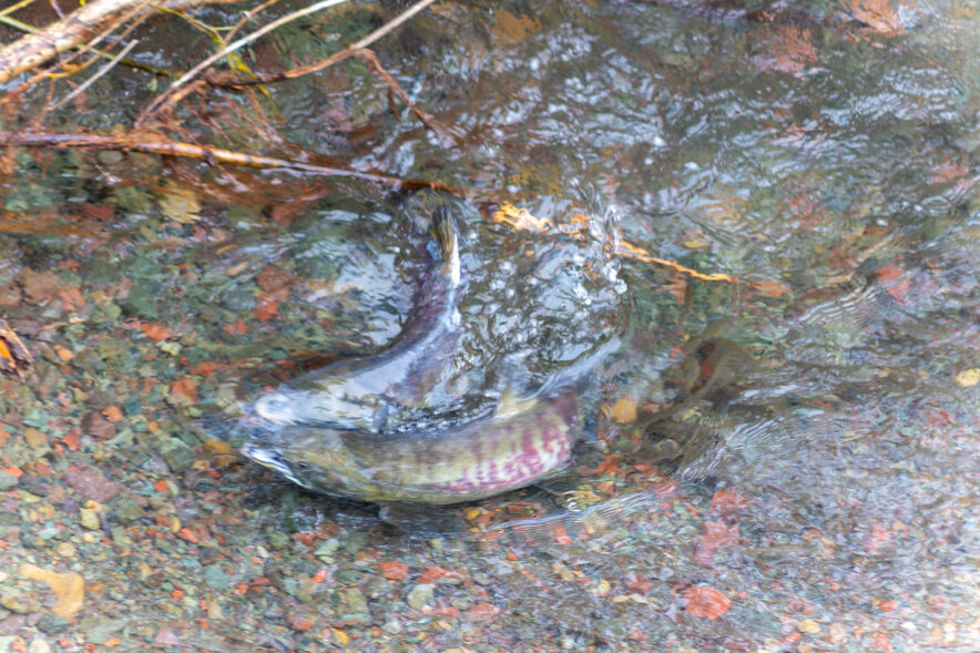 シロザケは繁殖行動が終わればあとは死ぬだけ──最後の大仕事に、他のオスのシロザケにも私にも構っている余裕などないのです。