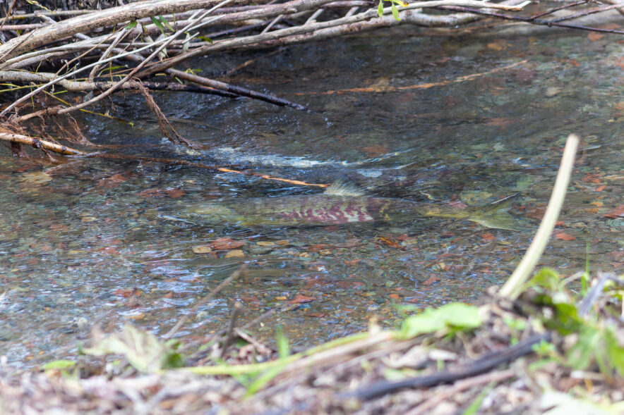 ついに会えました、野生のシロザケです。もう上から見下ろすだけでも、その体色がかっこいい。