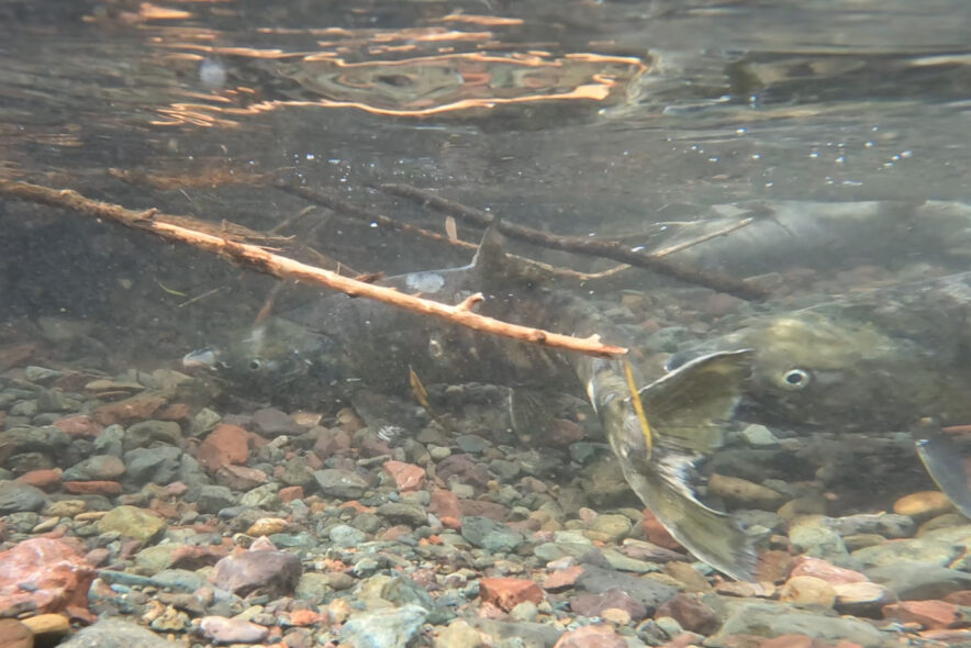 そんなほっちゃれの周りをよく見ると、水面がバチャバチャと揺れています。そこには、熾烈な争いを繰り広げているシロザケのオスの姿……!