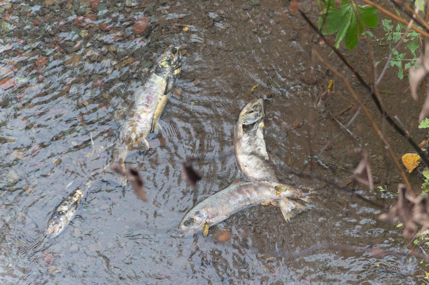 シロザケ遡上&産卵を観察できるというポイントに到着し、まず目に飛び込んできたのは「ほっちゃれ」たち。ほっちゃれとは北海道の方言で、産卵を終えた力尽きたサケのことです。