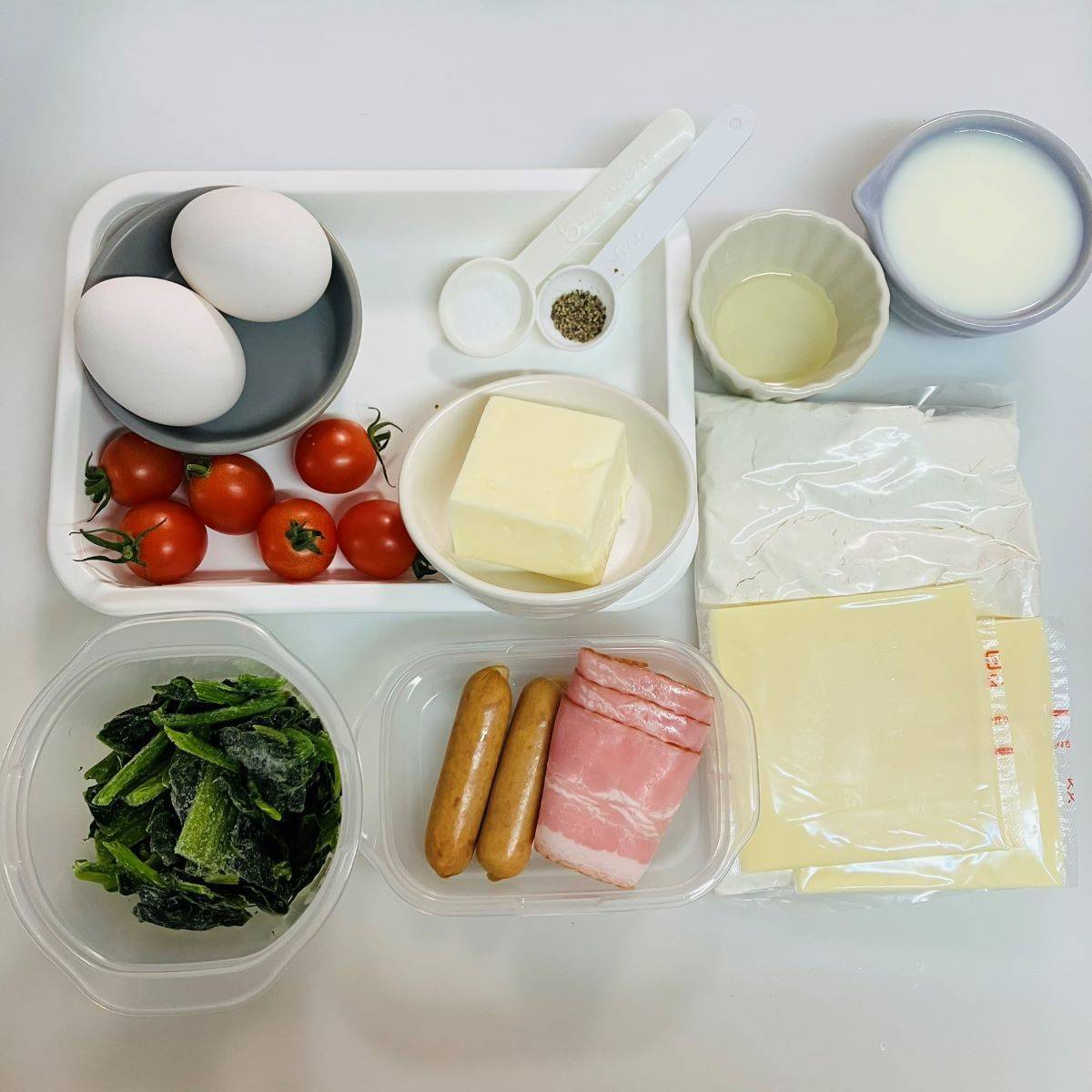 ミニトマト・ベーコン・ウインナー、それぞれの旨味があり、卵でぎゅっと閉じ込められています。