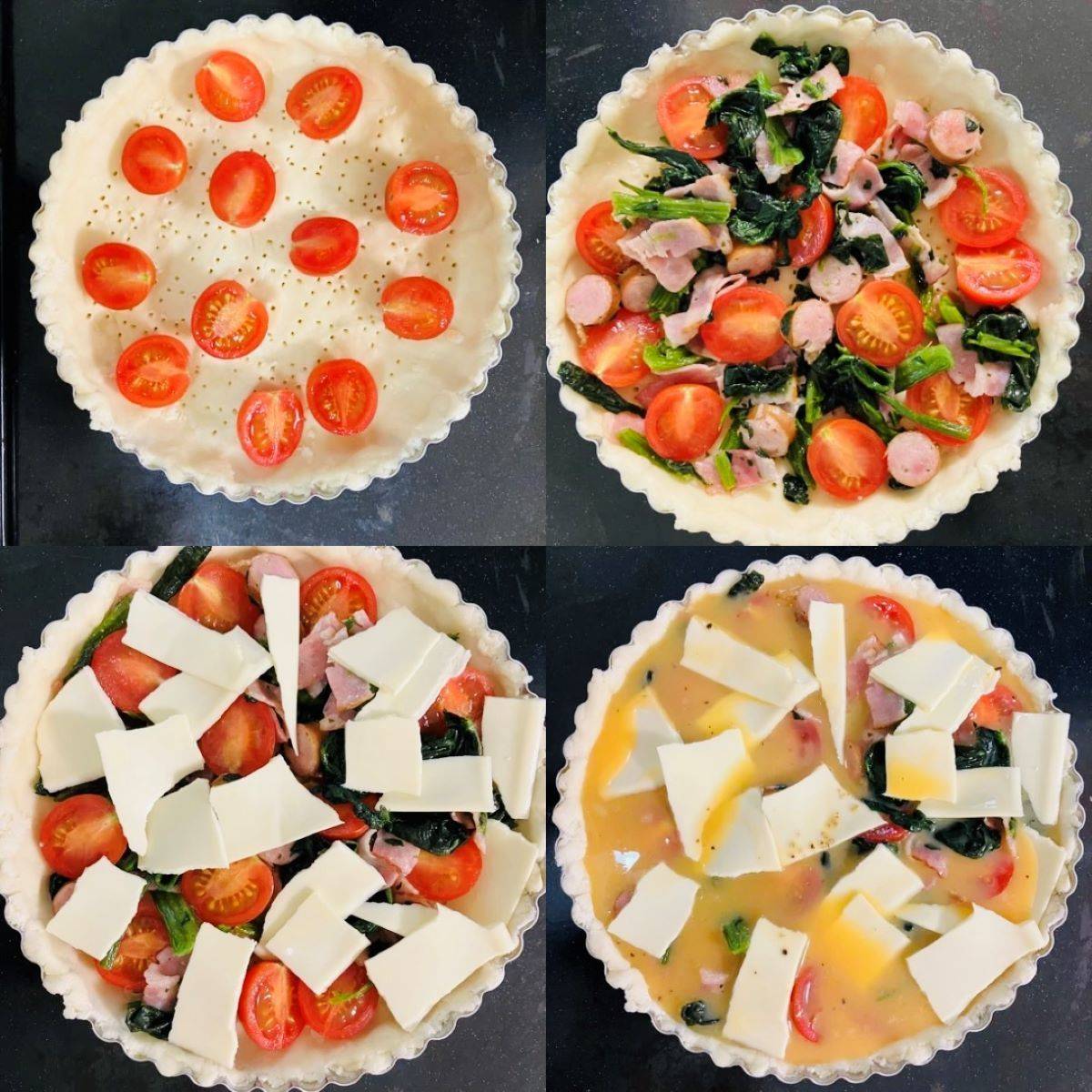 生地に、ミニトマト・②の具材・ちぎったチーズをのせ、卵液を入れます。