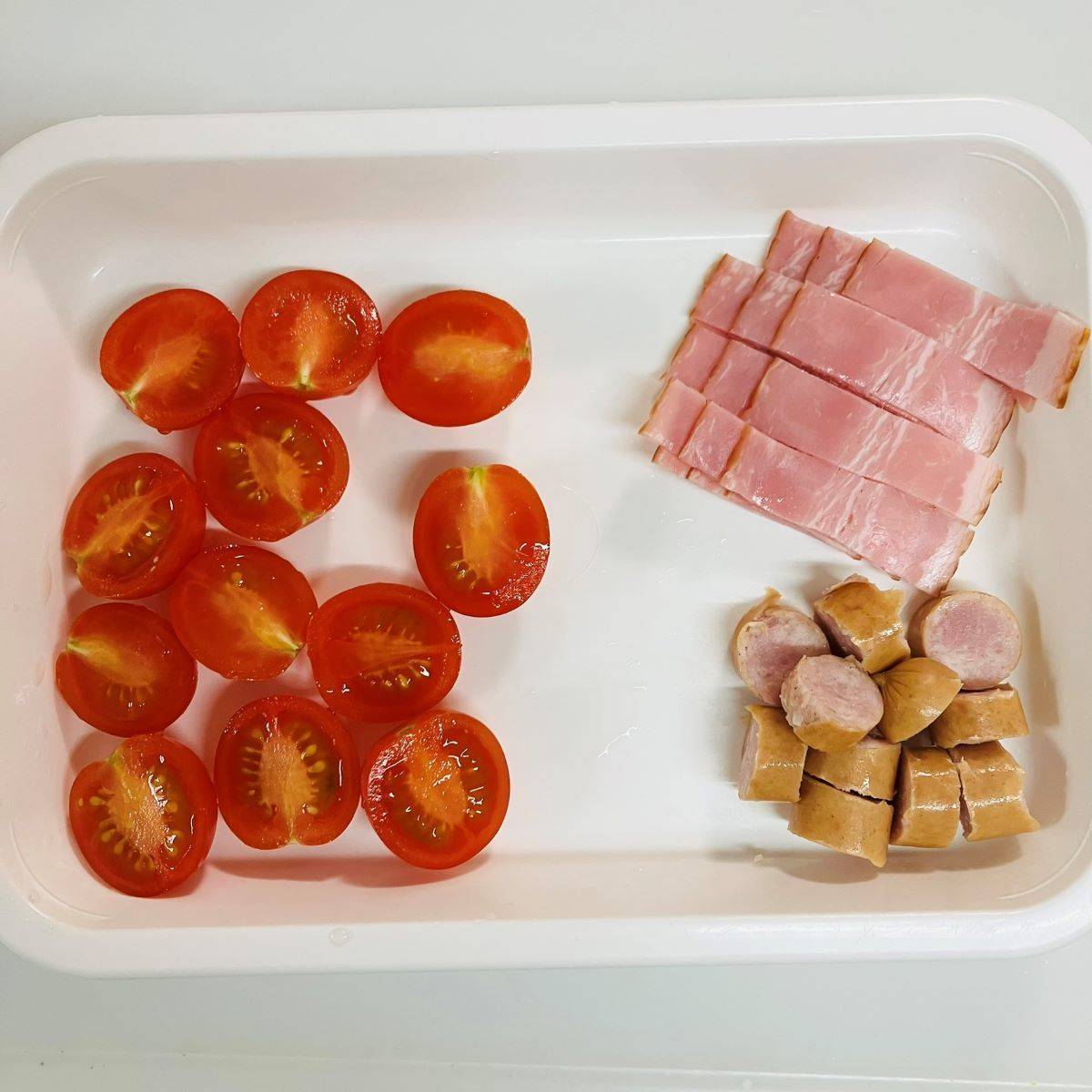 ベーコンは1cm幅にスライスし、ウインナーは輪切りにしましょう。