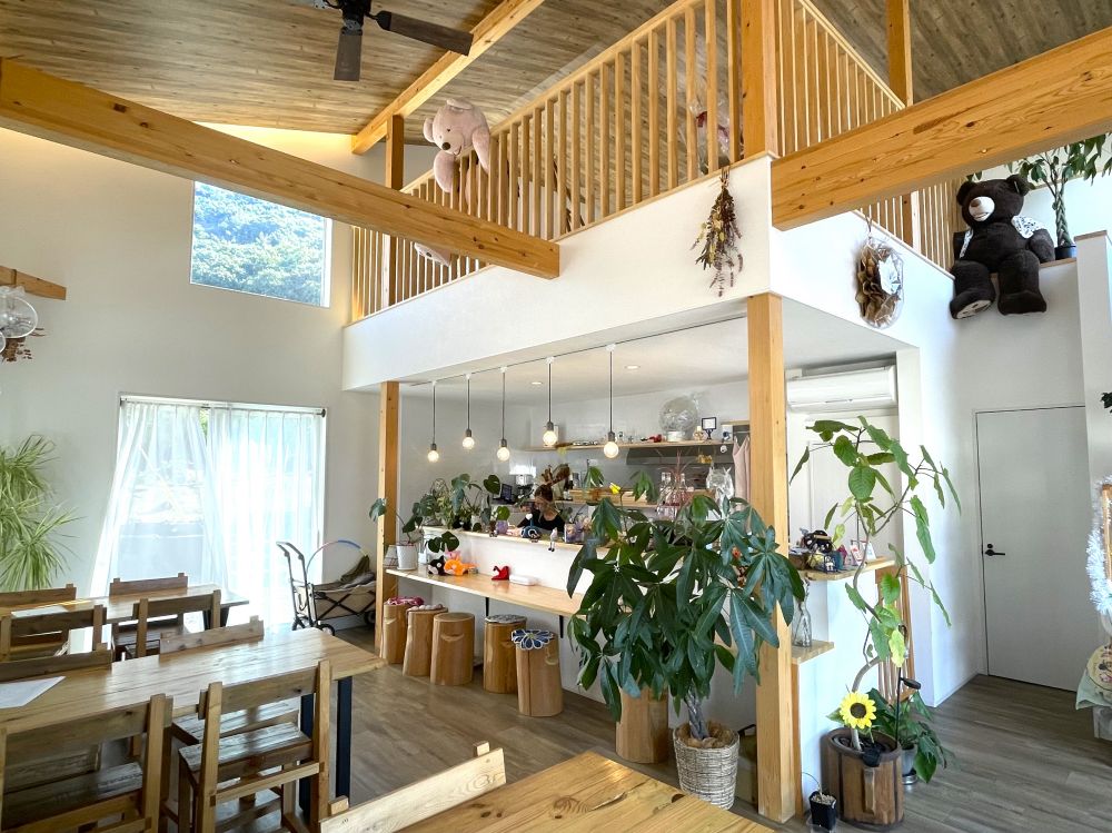 思わず笑顔になるNicoBooのロゴ。 おばんざいがいっぱいのランチが好きで、カフェを始めたオーナーの内芝侑里奈さん。明るく開放的な店内には、たくさんの観葉植物に混じって、大きなクマのぬいぐるみがあちらこちらに。