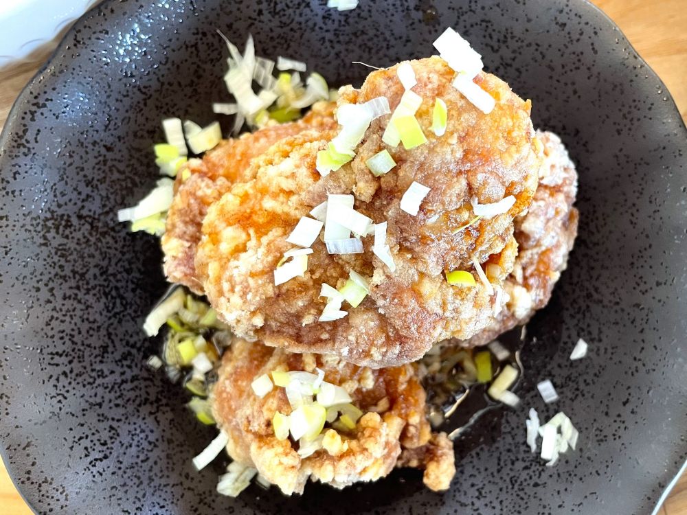 油淋鶏は、外はカリカリ、中はジューシー。香りの良い長ネギがたっぷり。甘辛いのにさっぱりしたソースが最高です。