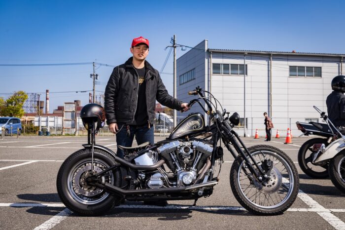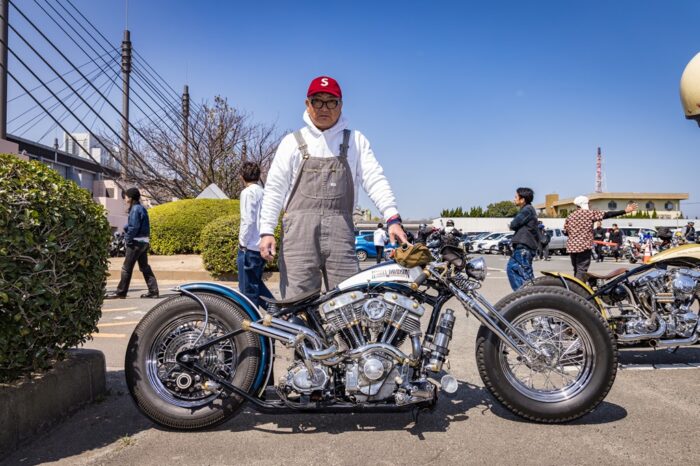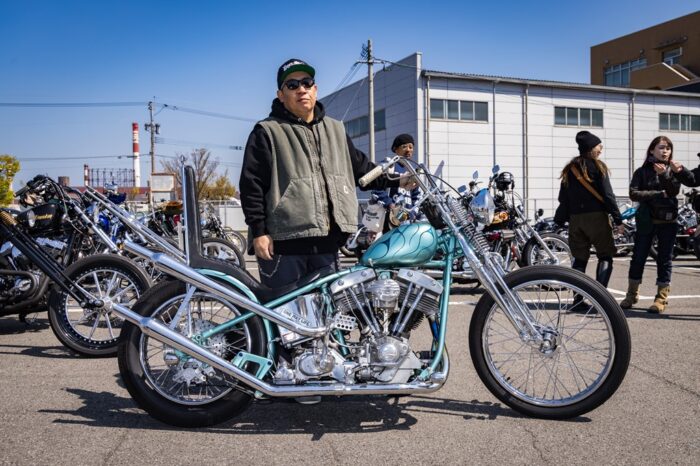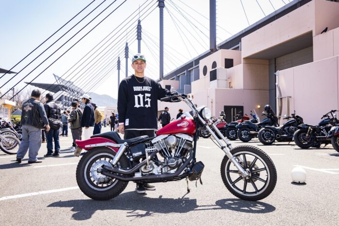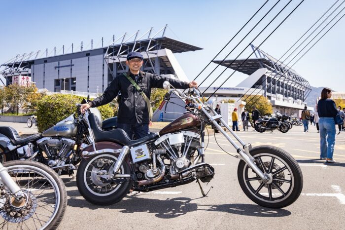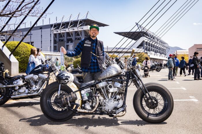 雰囲気のあるオールドスクールチョッパーで来場した飯星さん。ホワイトのガスタンクに同色のシートを合わせるなど、センスある配色&パーツチョイスが魅力的だ。なんと飯星さんは沖縄からの参加。ショー後は九州でライディングを楽しむ予定だと話してくれた。