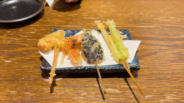 (画像左より)ひと串天ぷら えび天(418円)、なす(165円)、アスパラ(330円)