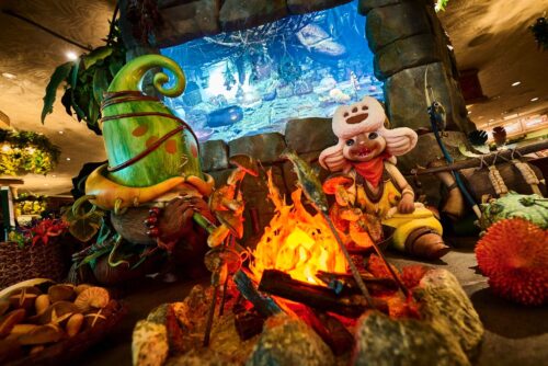 ロストワールド・レストランが、モリバーのアジトに生まれ変わり、ゲーム内で食べられるような料理が並びます。
