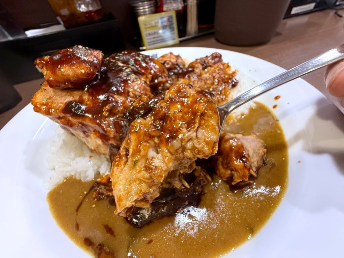 序盤、デミグラスソースやカレーと一緒に肉を食べているうちは問題が無かった。……が “肉塊” という通り、豚肩ロース肉はかなりデカい。徐々に肉が余り出した結果、終盤は肉単体で食べることになってしまった。