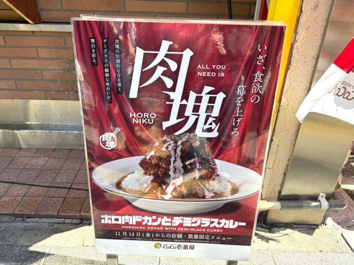 2025年11月、一部の「CoCo壱番屋(以下、ココイチ)」で『肉塊カレー』の販売が始まった。今回の商品名は『ホロ肉ドカンとデミグラスカレー』で、肉の量に応じてレベル1~4まで用意されている。