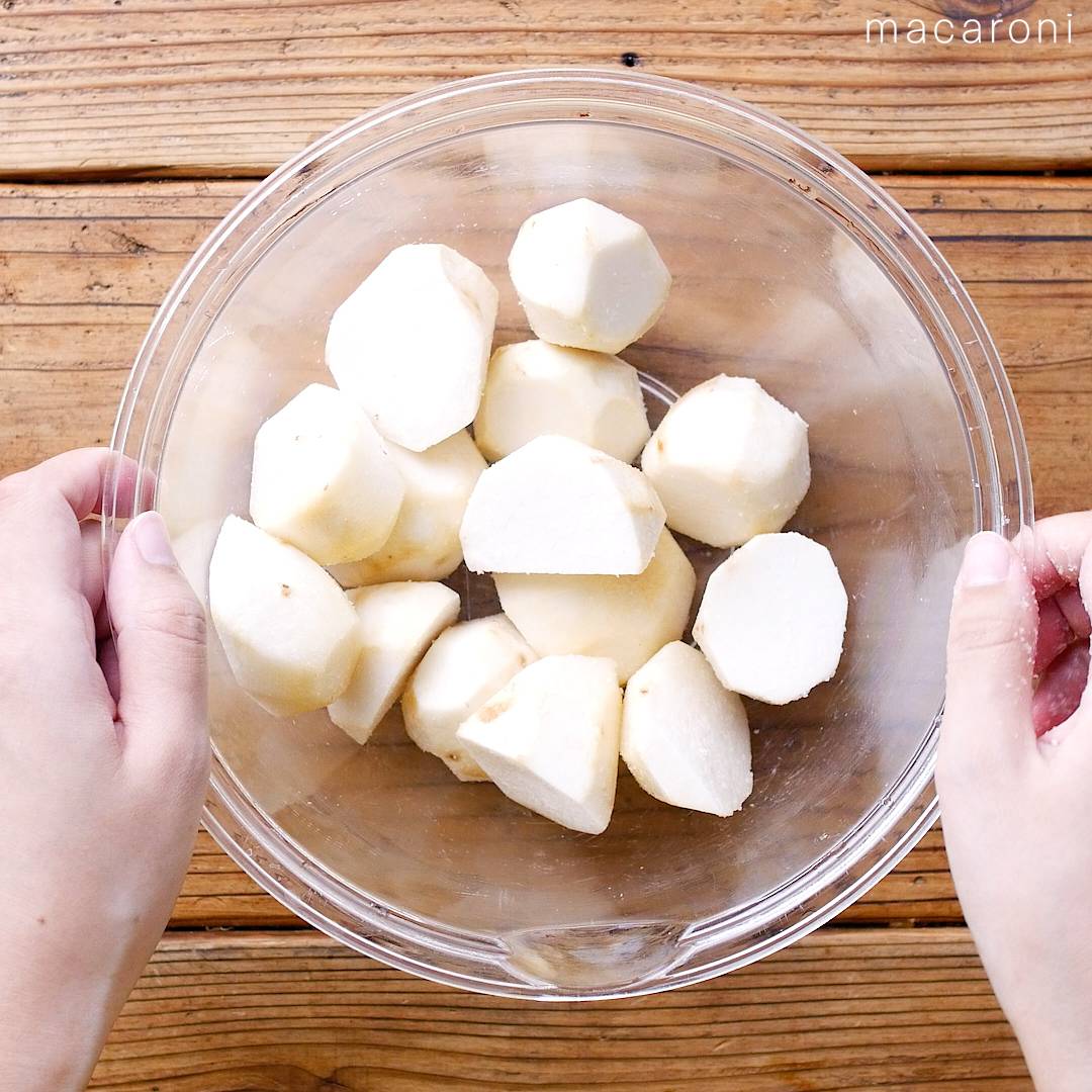 1: ボウルに里芋・塩を入れて揉み込み、ぬめりを落として水洗いします。