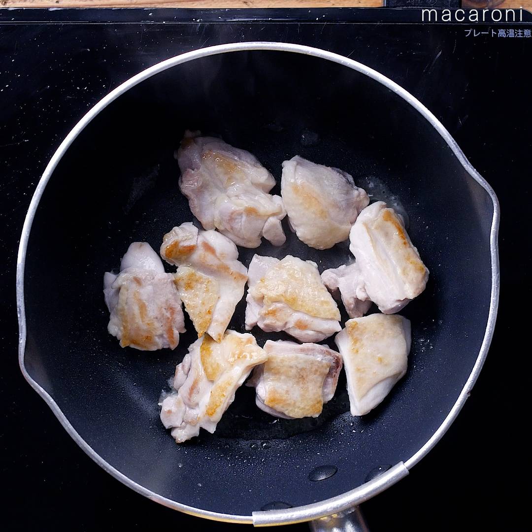 2: 鍋にサラダ油を引いて熱し、鶏肉を皮目から並べて焼き色がつくまで中火で焼きます。