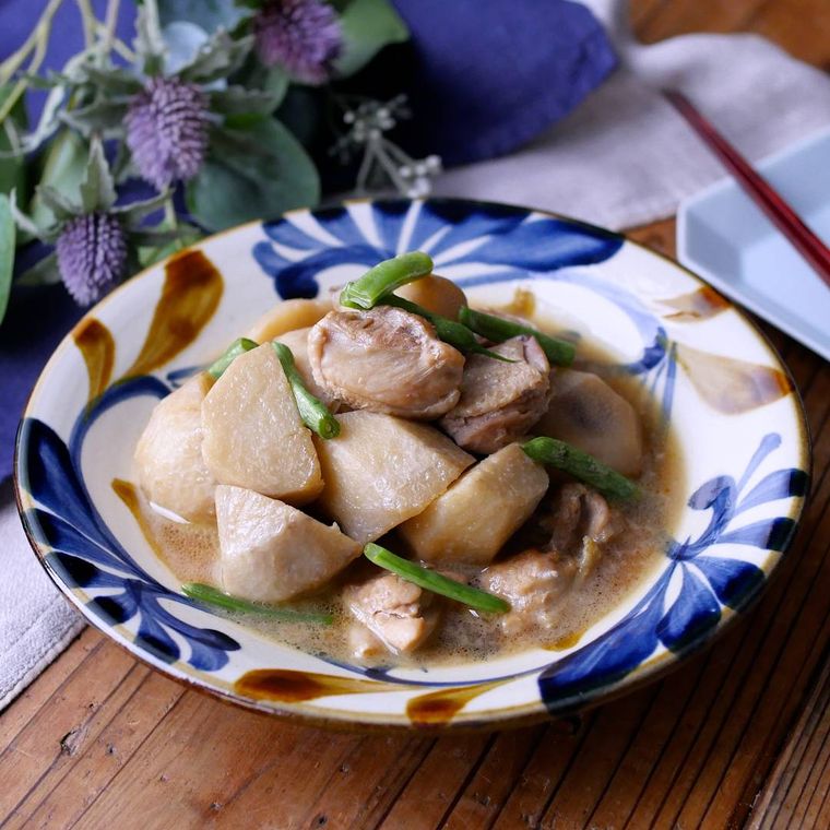 沸騰したら鶏肉を戻し入れ、落とし蓋をして弱中火で30分ほど煮込みます。