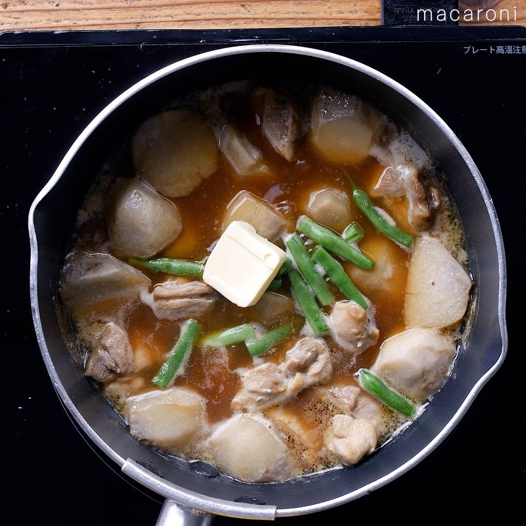 5: インゲンを入れてさっと煮たら、火を止めて、バターを加えて全体を混ぜます。