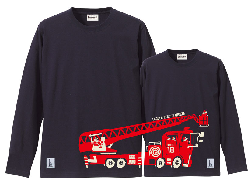 画像は、神戸市消防局とウミキリンがコラボした人気のつながる長袖Tシャツ『はしご車』。ブルーに赤の迫力のあるはしご車はとっても目立って、消防車好きの子ども達にも人気の商品です。