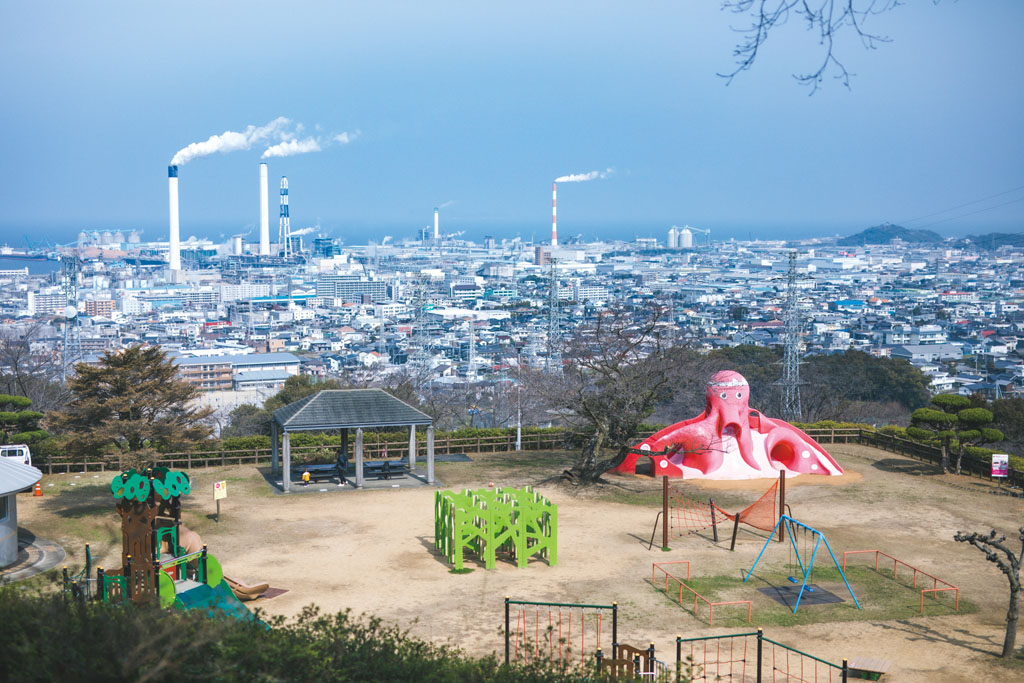 工場群と瀬戸内海の絶景をシンボリックな遊具から見下ろす。地元の人におなじみの公園。タコすべり台がカワイイ。新しい遊具も登場しさらに遊びやすくなった。