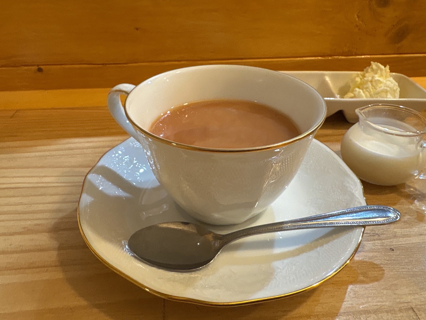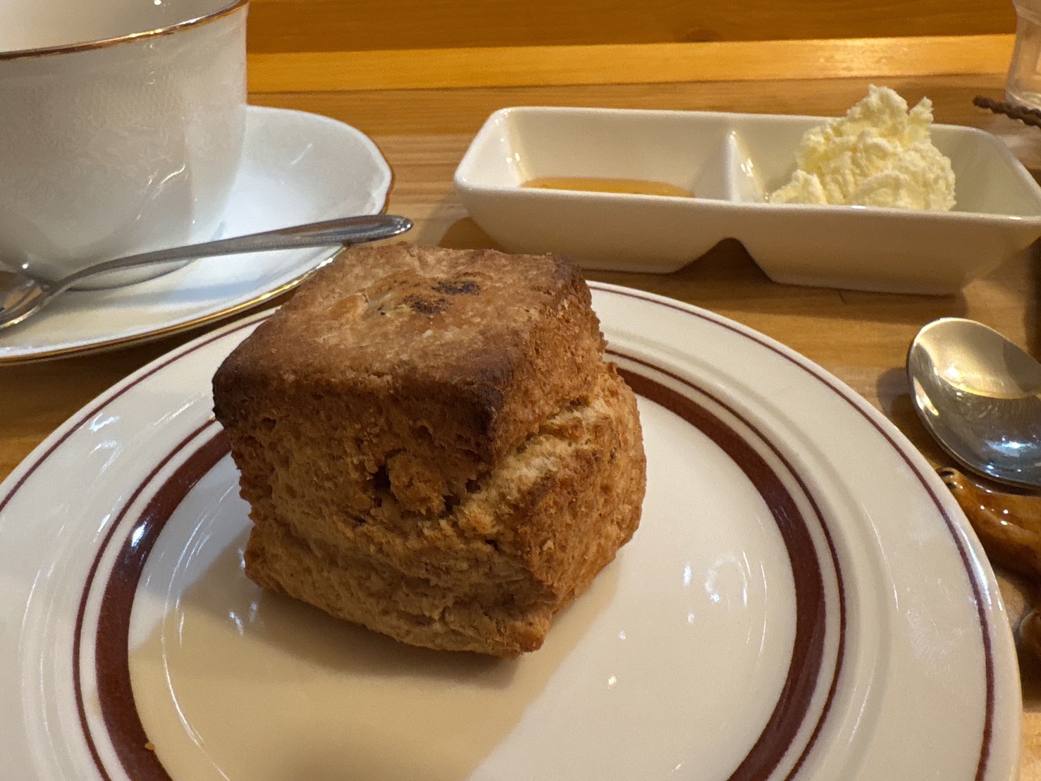 こちらは、スコーンと紅茶に、クロテッドクリームとはちみつが添えられた贅沢なお茶セット。