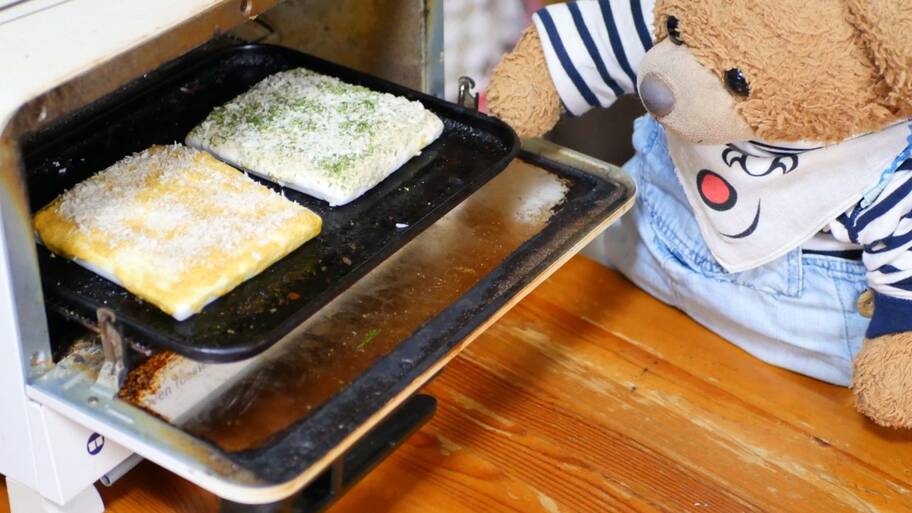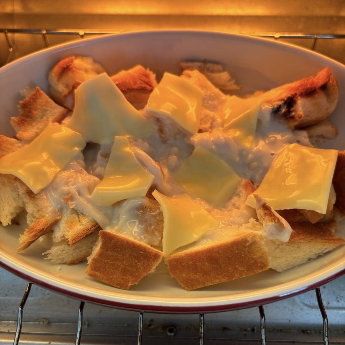 食パンの耳を一口大にちぎり、グラタン皿に並べたら、トースターで1分ほど焼きます。