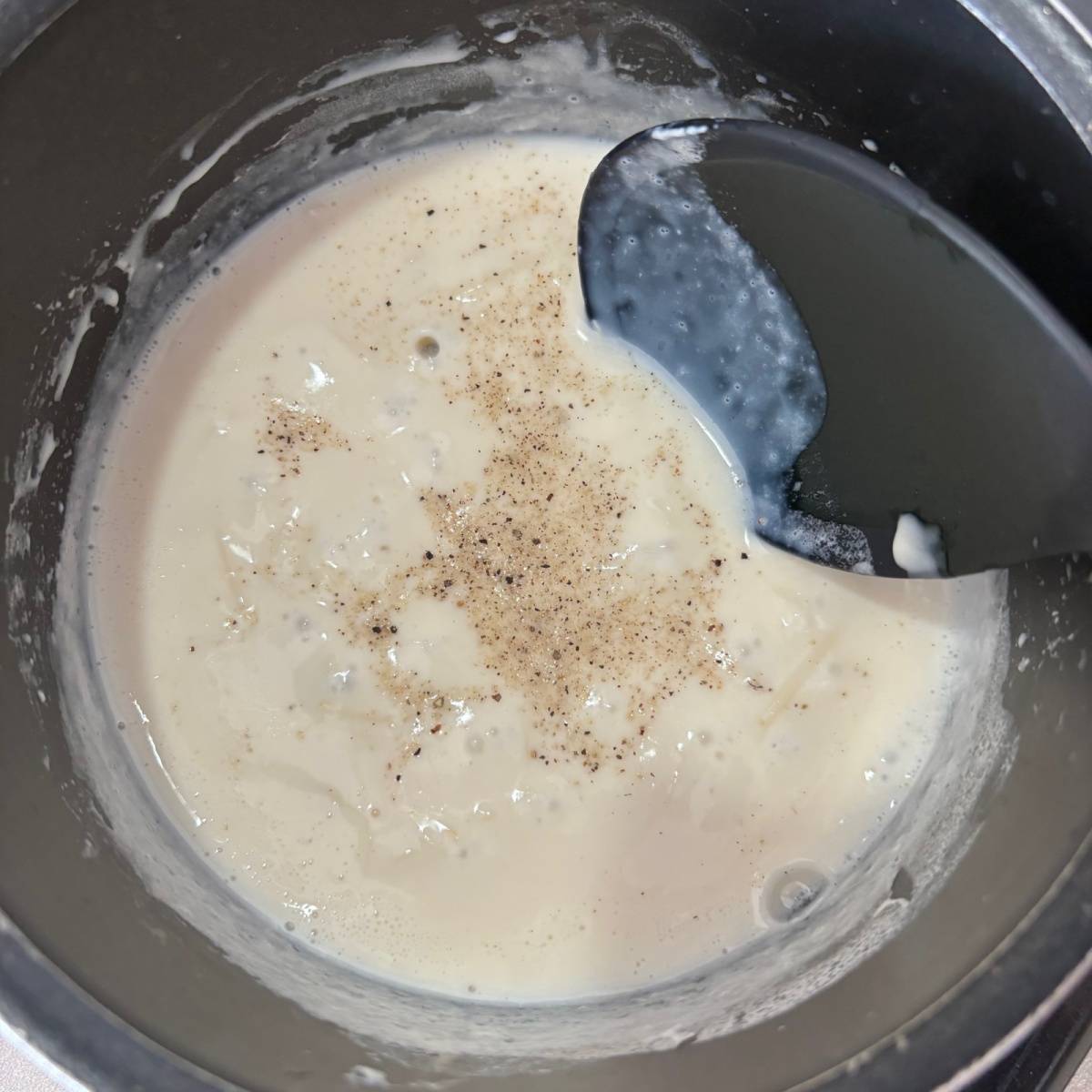 そこへホワイトソースを加え、さらに1分ほど温めたら、塩こしょうで味を調えましょう。