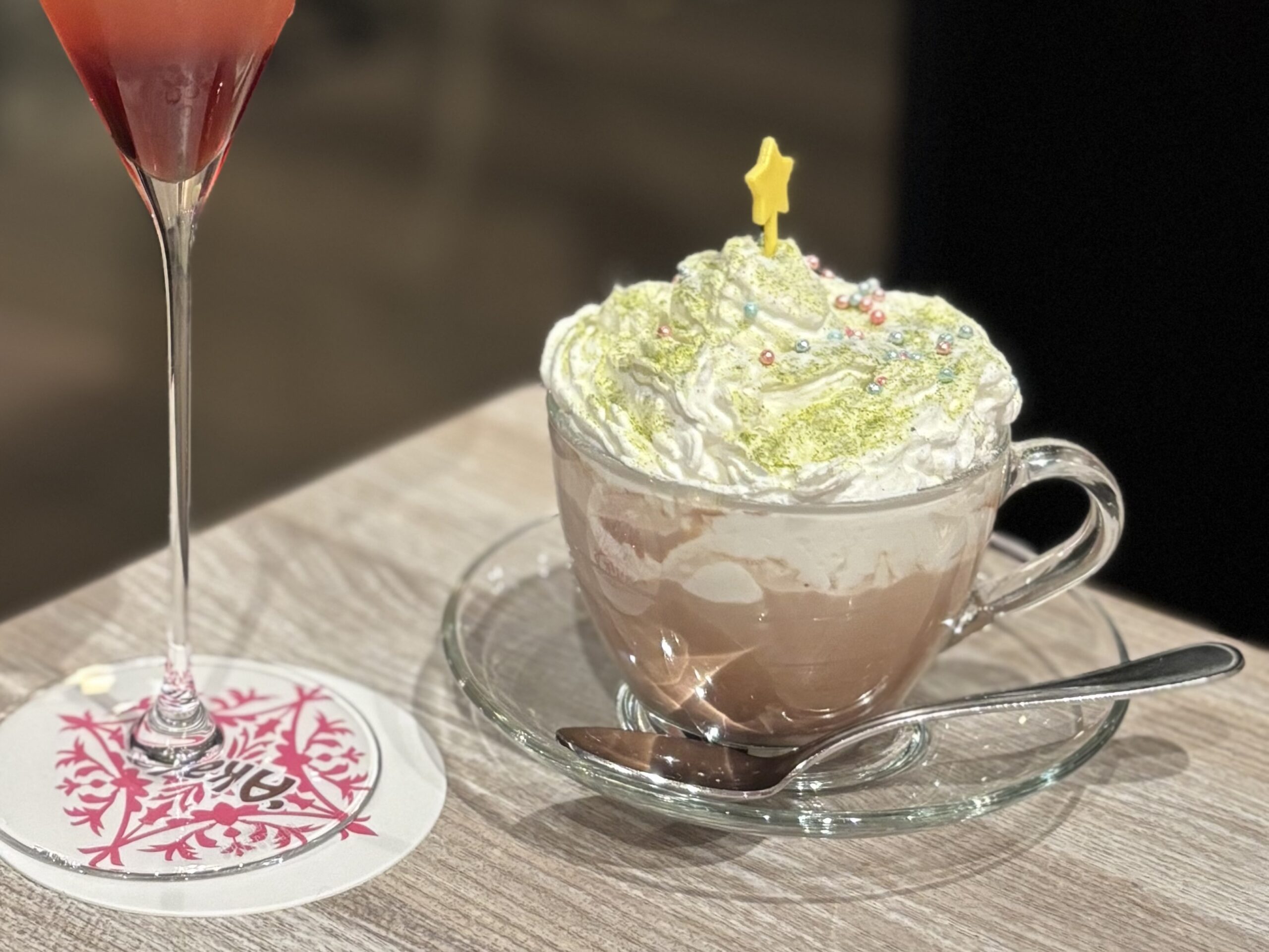 ココア風味に抹茶の香りとキラキラと輝くアラザンで“雪の星屑”をイメージしたドリンク。