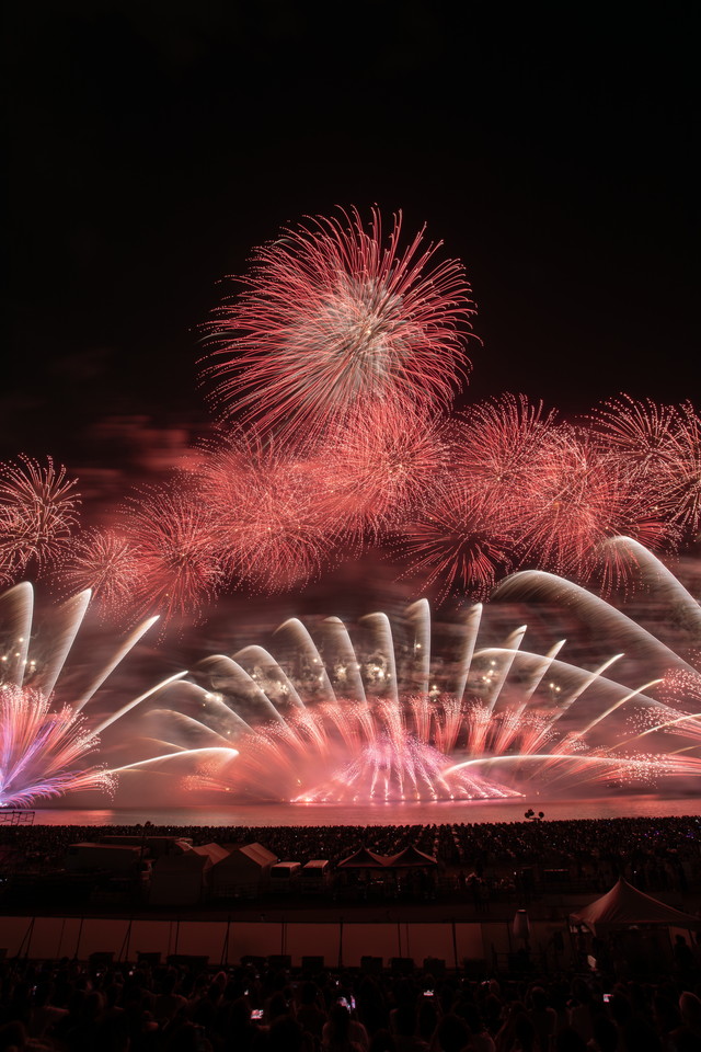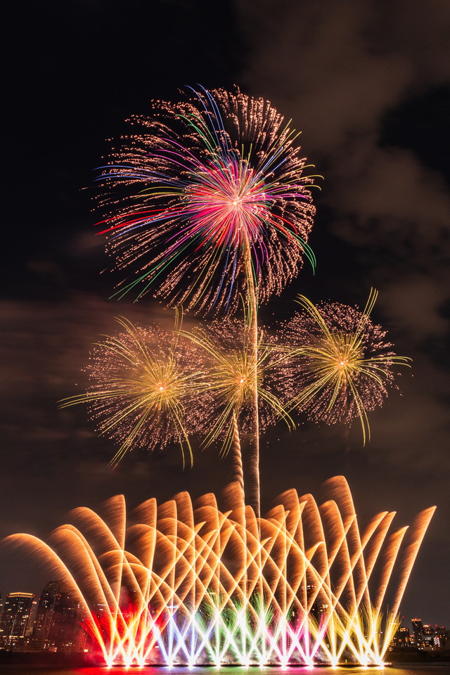 まずは内閣総理大臣賞受賞経験のある煙火店が、本イベントのためだけに制作した芸術花火を披露して開幕。さらに日本に古くから伝わる和火花火や虹を表現する速射一斉100発、近年流行している時差式、スターマインや創造花火などを経て圧倒的なスケールを誇るグランドフィナーレへ! 水面に咲く大迫力の水中花火とともに、なにわの空が花火で埋め尽くされます。