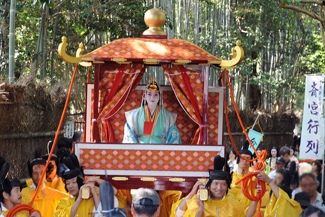 かつて行われた「斎王群行」を再現した「斎宮行列」では、約100人もの人々が華やかな時代装束を身にまとい、嵐山一帯を練り歩きます。縁結びの神として知られる野宮神社をスタートしたあとは、JR嵯峨嵐山駅や天龍寺前、渡月橋を越えて嵐山公園の北乗船場まで巡行。絢爛豪華な行列を見学できます。