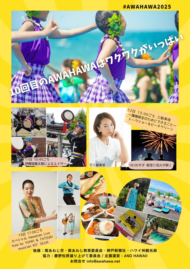 淡路島とハワイの融合イベント「AWAHAWA」が、美しい淡路島のビーチを舞台に実施されます。今回は10回目となるアニバーサリー開催。全国から約1,500名のフラダンサーが集結し、終日ノンストップで華やかなショーを繰り広げるほか、11日には伊賀流真太鼓によるエイサー、12日にはトークイベントや花火の打ち上げ、13日にはスペシャルハワイアンライブなどが行われます。会場ではハワイのロコフードをはじめとするさまざまなグルメ屋台や雑貨店も楽しめます。