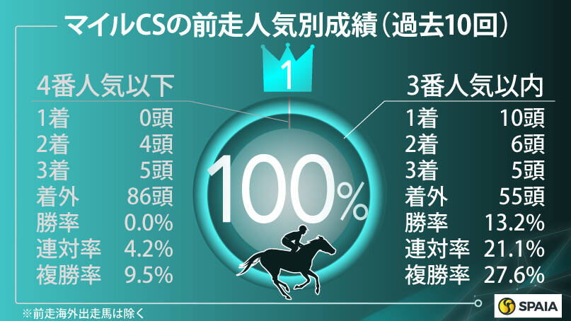 出走数なら[0・1・2・28]のスワンS組も互角だが、本番では成績が振るわず、23、24年は出走馬がなかった。ローテーションの面では、連対馬20頭中18頭が同年9月以降にレースを消化していた。例外は15年1着モーリス、20年2着インディチャンプ。共に安田記念好走後、ぶっつけで挑んできていた。これぐらいの馬ならば要チェックだが、基本、休み明けはマイナスとなる。