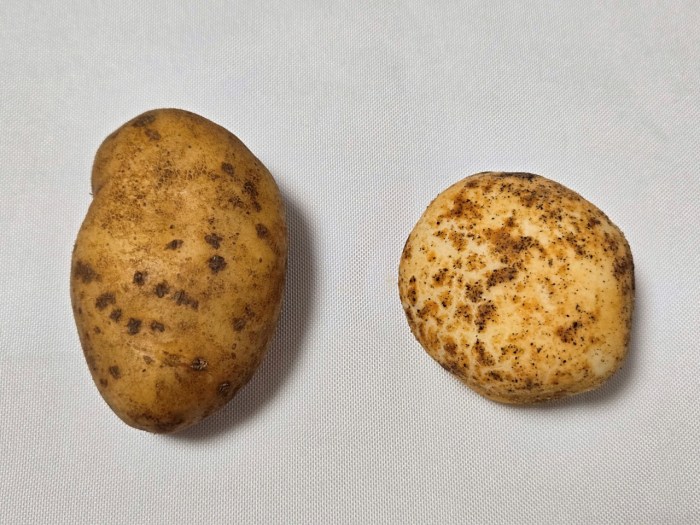 せっかくなので本物のジャガイモと比べてみたけど、やはり良い勝負をしている。この表面に塗布されたきな粉と黒胡麻の粉が良い仕事してるんだよね。