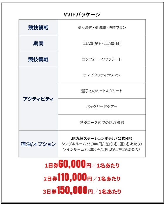 「VVIPパッケージ」は、11月28日(金)女子・男子 準々決勝/11月29日(土)女子・男子 準決勝/11月30日(日)女子・男子 決勝の3日間が対象となるパッケージプラン。コースサイドが目の前に広がるエリアに設けられたプレミアムな観戦席「コンフォートソファ」で、ダイナミックなパフォーマンスを観戦できるほか、会場に設けられた「ホスピタリティラウンジ」で北九州の食材をふんだんに使った食事や地酒を味わうことも可能。
