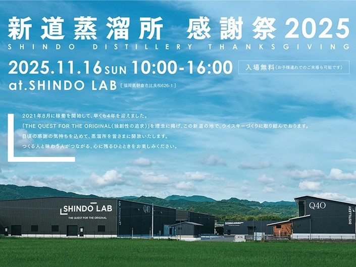 九州の酒どころ、福岡県朝倉市の酒造『篠崎』が運営する新道蒸溜所が、日頃の感謝の気持ちを込めて、年に一度の『新道蒸溜所 感謝祭』を11月16日(日)に開催します。ウイスキー蒸溜所ならではの貴重な体験から、人気バーテンダーによるカクテルの提供、福岡の人気グルメまで、大人が心ゆくまで楽しめる特別な一日です。