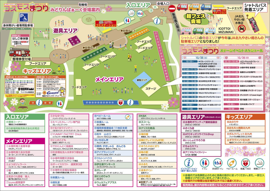 猪熊河川敷臨時駐車場 ⇔ コスモスまつり会場 古賀河川敷臨時駐車場 ⇔ コスモスまつり会場 JR水巻駅(南口)⇔ 南部公民館 ⇔ 総合運動公園 ⇔ 会場