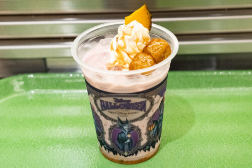 “ディズニー・ハロウィーン”スペシャルドリンク(800円)は、キューブ状の大学芋入り。ミルクやホイップクリームのまろやかな甘さに、大学芋やかぼちゃチップスの食感が加わった、甘さいっぱいのドリンクです。